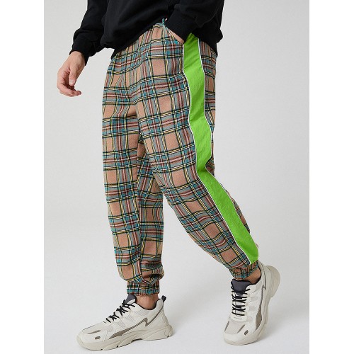 Mens Plaid Cotton Side Patchwork Drawstring Elastic Waist Jogger Pants With Pocket