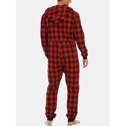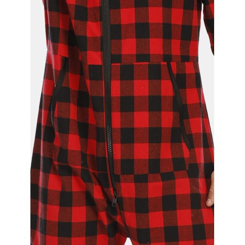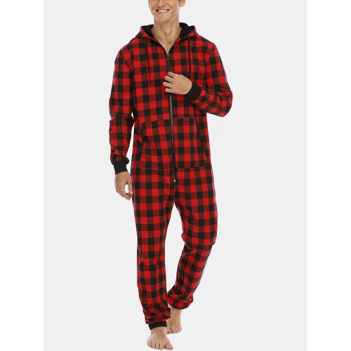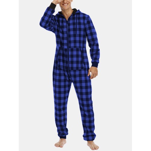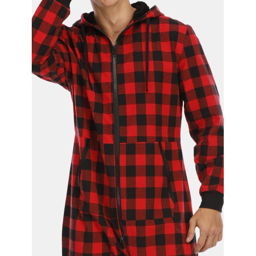 Mens Plaid Zipper Front Kangaroo Pocket Hooded One Piece Jumpsuit Home Warm Sleepwear